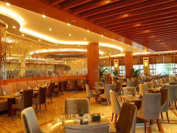同时饭店也拥有完善的餐饮设施,饭店一共拥有三个餐厅和一个酒吧。位于饭店首层的金源自助餐厅,一共拥有220个餐位。供应中、西、日相结合,以海鲜为主的自助餐。餐厅布局风格独特,颇具异国情调及神秘浪漫之感。是理想的商务用餐场所。金世纪中餐厅位于饭店二楼,主要经营粤、湘等菜品,拥有19间豪华江景包厢。位于饭店三层的全城唯一正宗日本料理,让您真正感受日本美食。